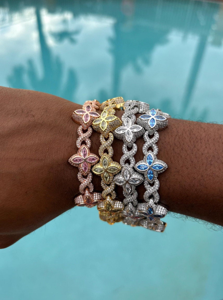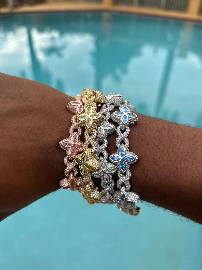 Each bracelet features hand-set CZ stones that form radiant floral links, locked in by a precision-engineered clasp for a flawless finish. Whether you’re dressing up or flexing daily, this piece delivers ice-level shine with timeless design.